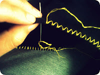 3. Once cut (preferably with a pair of fabric scissors), fold over approx. 1cm hem. Pin in place and secure with zig-zag stitch using two strand yellow thread.